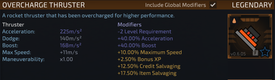 This was actually done in v0.6.04, legendary thrusters and shields can now have 4 x global modifiers, as they both have limited useful regular modifiers to choose from. This mirrors the behaviour of passive items when legendary.